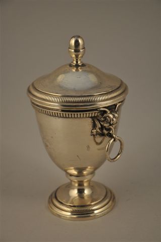 DRAGEOIR en métal argenté en forme de coupe, décor de godrons, prises latérales à têtes de faunes tenant dans leur bouche un anneau. Couvercle rapporté en doucine, le frétel en forme de gland. Haut. 16 cm. (restauration au piédouche).