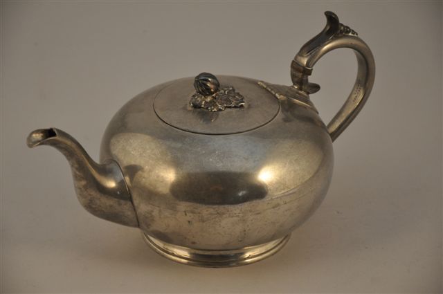GRANDE THÉIÈRE en métal argenté uni, le frétel figurant une fleur en bouton. Travail anglais marqué "James Dixon & Sons Sheffield". Fin XIXème. Haut. 15,5 cm.