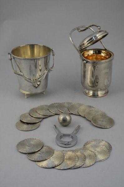 LOT comprenant : Deux SEAUX à GLACONS en métal argenté. L'un fermé, de forme cylindrique, sur piédouche, l'intérieur en verre isotherme. L'autre uni, orné en bordure de tores de lauriers, anse mobile feuillagée. SUITES de 12 et de 6 DESSOUS de VERRES en métal et métal argenté "vannerie".