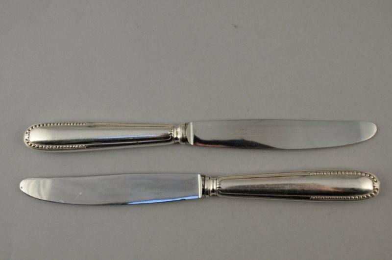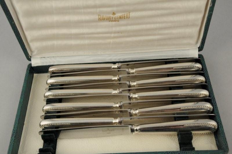 Ensemble de 31 COUTEAUX à manches en métal argenté, à décor perlé, lames inox, comprenant une suite de DIX GRANDS COUTEAUX et une suite de VINGT-ET-UN COUTEAUX à dessert. RAVINET D'ENFERT à Paris. Style Louis XVI.