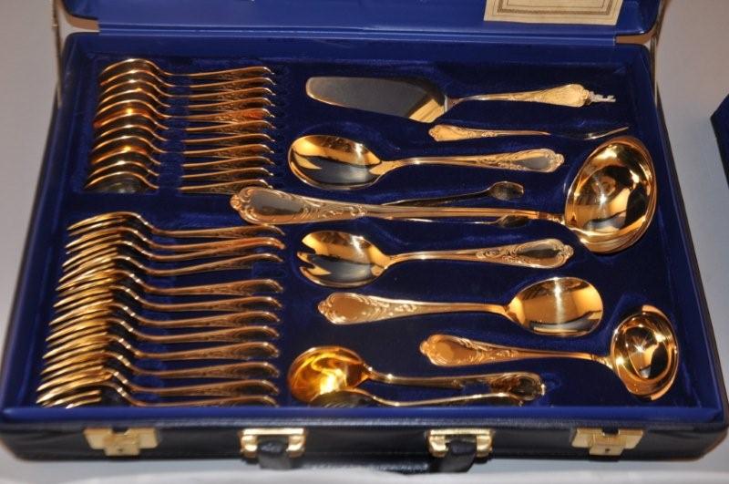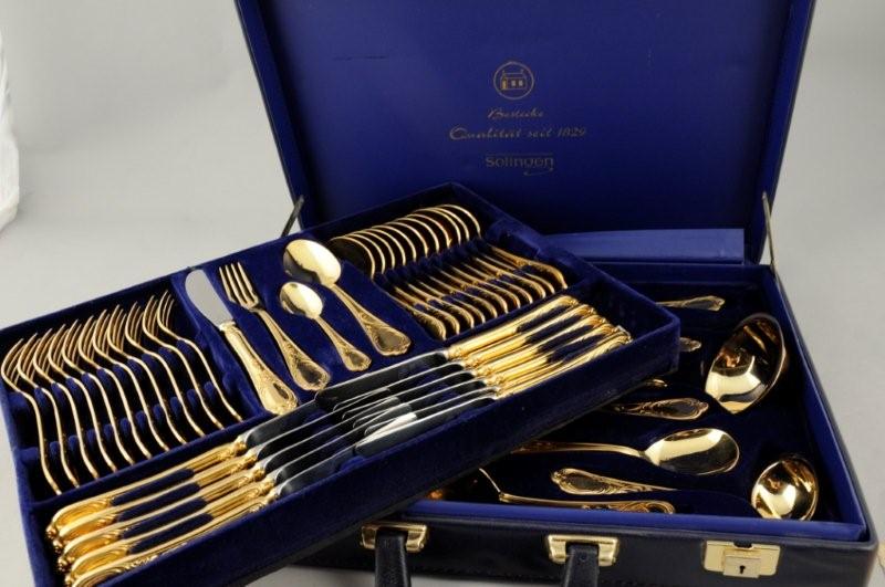 MÉNAGÈRE en métal doré 70 pièces comprenant 12 couverts, 12 couteaux lames inox, 12 cuillères à café, 12 fourchettes à gâteaux, et 10 pièces de service. Maison SOLINGEN. Dans une valise bleue (état neuf)