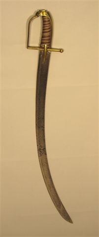SABRE DE HUSSARD modèle 1790. Poignée recouverte de basane avec filigrane (postérieur). Garde à une branche, poinçonnée au coq et deux oreillons en navette. Lame courbe à dos plat, contre tranchant, pans creux, marquée "Klingenthal" et gravée sur une face "Repe" et sur l'autre face "Frse". Traces de poinçons au faisceau de licteur.
