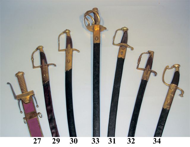 SABRE D'OFFICIER D'INFANTERIE du 8ème Régiment. Poignée en ébène à quadrillage en losange. Calotte à longue queue gravée. Garde à une branche ornée au centre d'une tête à l'antique à petit clavier à jours au chiffre VIII sous faisceau d'armes. Lame courbe à dos plat, contre tranchant, pans creux et gouttière (piqûres). Fourreau en cuir à deux garnitures en laiton découpé.