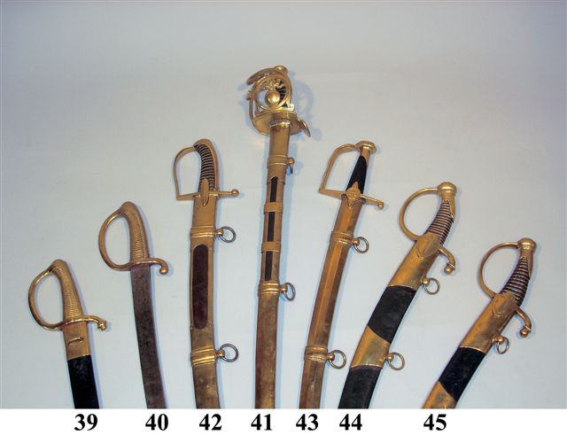 SABRE D'INFANTERIE modèle an XI dit "briquet". Monture en laiton. Poignée à vingt-huit godrons. Garde à une branche poinçonnée. Lame courbe, à dos plat, gravée "Man. Imp. du Klingenthal. Avril 1813", poinçonnée au talon.