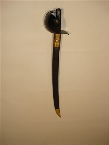 SABRE DE BORD modèle an IX dit "cuillère à pot". Poignée et monture en fer. Garde à coquille, quillon à palmettes. Lame courbe, à dos plat, contre tranchant et pans creux, gravée "Mafture Imple de Klingenthal. Février 1812" et d'une ancre de marine sur chaque face. Fourreau en cuir à deux garnitures en laiton.