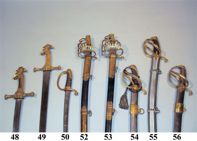 GLAIVE DE SAPEUR. Poignée à tête de coq hurlant. Monture en laiton. Garde à deux quillons droits et noeud de coeur orné d'une tête de lion. Lame droite à dos scie, contre tranchant, marquée au talon "Klingenthal" et "Coulaux a et c", poinçonnée.