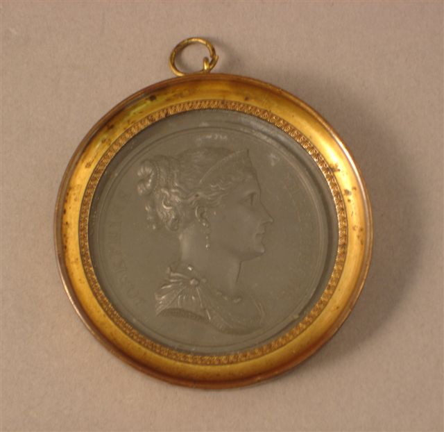 Médailles uniface, tirage en étain à patine bronze. Dans un cadre rond en bronze doré ciselé de palmettes.