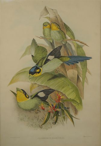 Joint: d'après J. GOULDAND et H.C. RICHTER. Oiseaux exotiques: Psarisomus Dalhouslae et Pitta Schwaneri. Deux lithographies en couleur formant pendants. 53 x 37 cm.