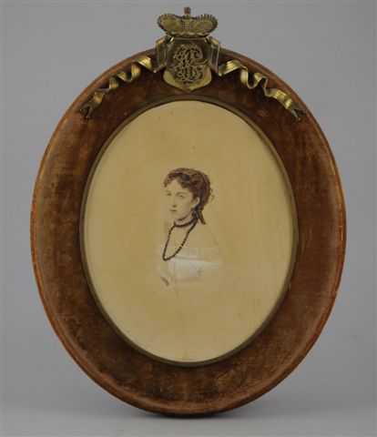 Gouache aquarellée et rehauts de craie blanche signée en bas à droite, dans un cadre ovale de velours cramoisi surmonté d'un monogramme en bronze doré couronné de Prince du Saint Empire Romain Germanique.
