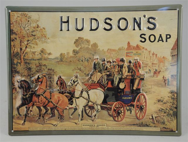 Joint: plaque publicitaire HUDSON 'S SOAP en tôle repoussée, moderne.