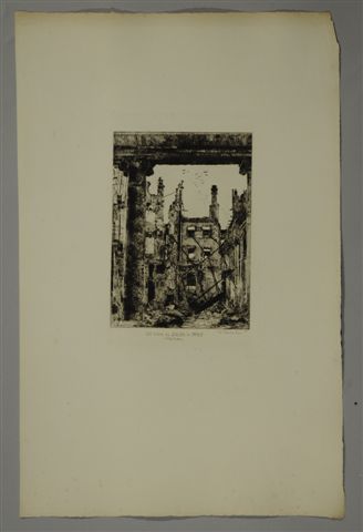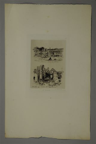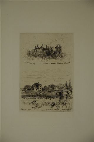 Ensemble de 10 eaux-fortes dont "Saint-Cloud brûlé, Gourbi prussien, Hôtellerie de la Tête Noire, Patrouille prussienne dans Saint-Cloud, rue Royale". Signées et datées dans la planche. Imp. CADART et LUCE.
