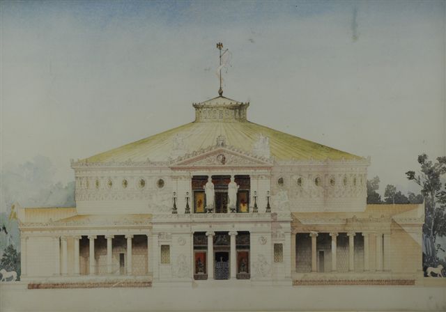 Reproduction en couleur d'un dessin d'architecte, encadrée.