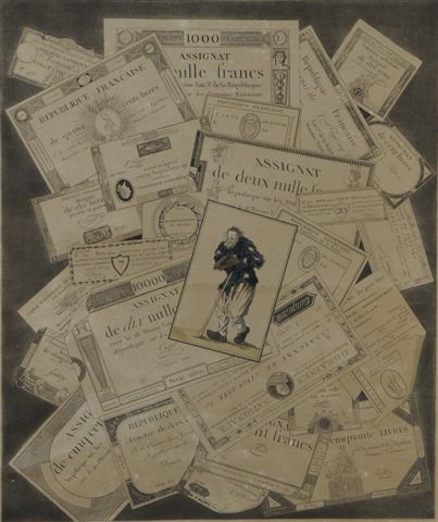 VARIA. Pêle-mêle d'assignats en TROMPE L'OEIL. Au centre, un homme ruiné!
