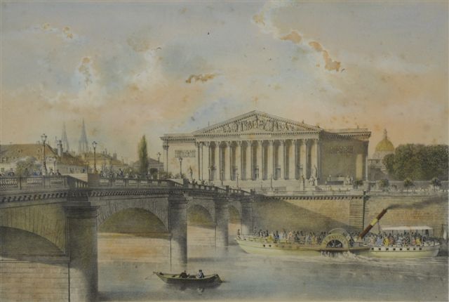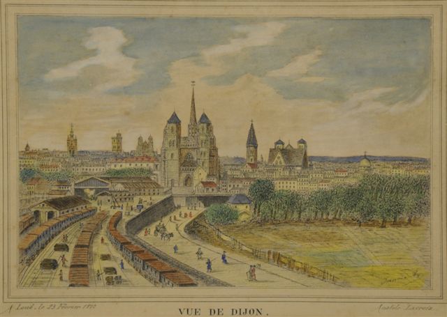 QUATRE GRAVURES dont trois du XIXe siècle (Mode, Ville de Dijon et Chambre des députés) et une du XVIIIe siècle (Portrait d'un géographe).