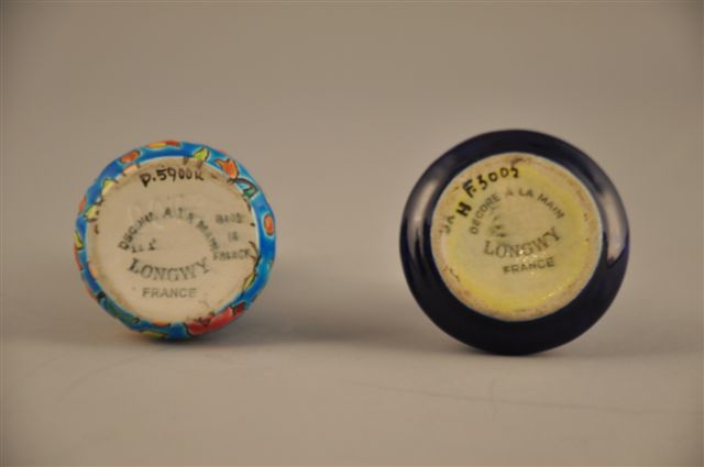 LONGWY. PAIRE DE PETITS VASES À COL en faïence, à décor de fleurs polychromes sur fond turquoise pour l'un et d'une frise de coeurs stylisés jaunes sur fond bleu foncé pour l'autre.