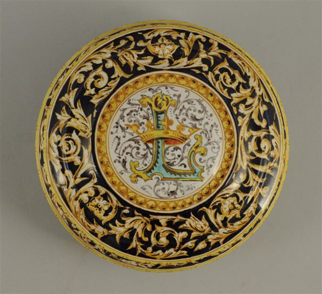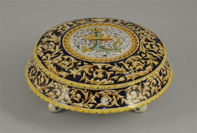 BLOIS. BONBONNIÈRE en céramique, de forme circulaire reposant sur trois petits pieds à enroulement et feuilles d'acante. Décor sur le couvercle au "L" turquoise couronné dans une frise d'oves, et rinceaux sur fond bleu nuit.