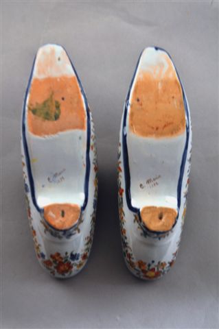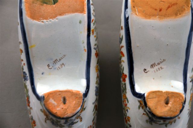 CHAROLLES. PAIRE DE CHAUSSURES en faïence, à décor polychrome dans les tons de bleu, ocre, vert et brique: sur l'une d'un enfant jouant et soufflant dans une trompe appuyé sur une barrière en bois et sur l'autre une petite fille se balançant dans un encadrement de guirlandes sur fond blanc, liseré bleu.