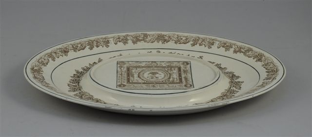 CREIL. PRESENTOIR ovale en faïence fine, le bassin en ressaut formant socle. Décor imprimé en sépia, sur l'aile et le marli, d'une double frise de pampres de vigne. Au centre, sont représentés trois putti dont l'un porte une corbeille de fleurs, entourés de deux figures allégoriques de Minerve ou la Moisson (?), encadrement à candélabres latéraux d'inspiration "grotesques", avec, au centre en partie supérieur, trois fleurs de lys couronnées. Filets noirs. Marque en creux "CREIL" et cachet en noir "Médaille d'argent (...) Exposition de 1819"