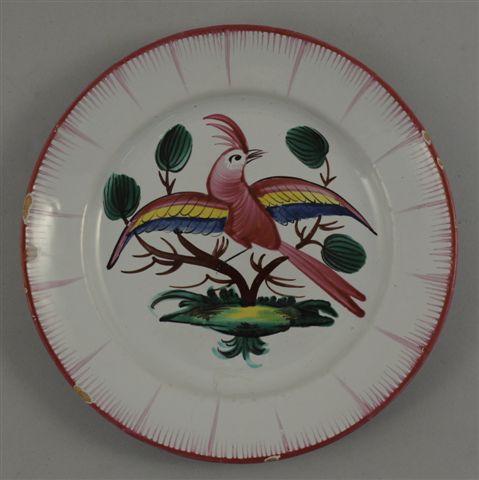 EST de la FRANCE. ASSIETTE en faïence à bordure au peigne. Décor dans le bassin d'un oiseau aux ailes déployées. Diam. 23,5 cm (égrenures)