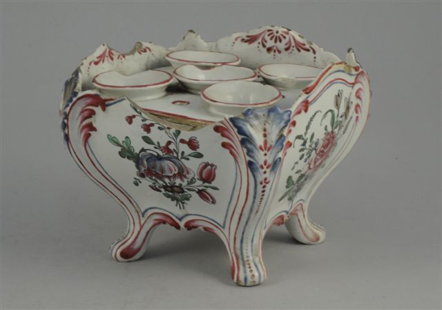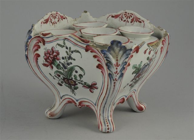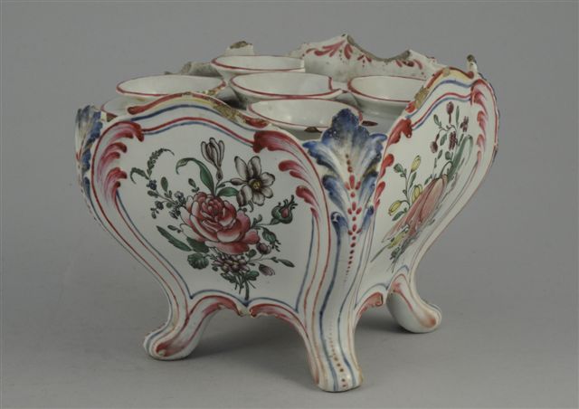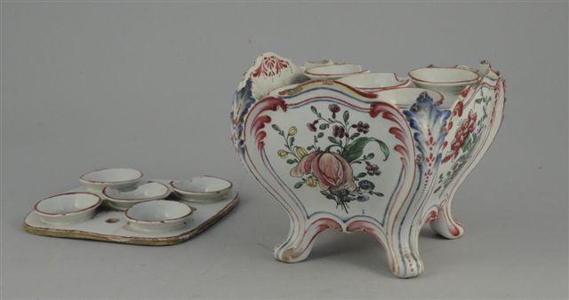 EST de la FRANCE. BOUQUETIERE cubique de forme chantournée,en faïence polychrome à décors de bouquets fleuris, montant en feuilles d'acanthes reposant sur quatre petits pieds galbés ; deux plateaux portes-bouquets à neufs trous.
