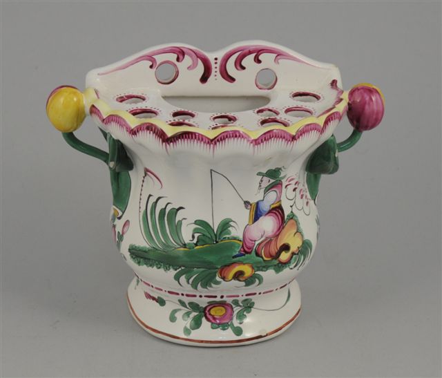 EST de la FRANCE. BOUQUETIÈRE d'applique en faïence de forme mouvementée. Décor polychrome "au chinois" pêcheur. Monogramme "CH" en bleu sous la base.