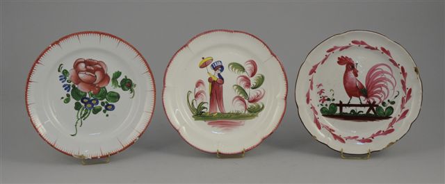 EST de la FRANCE. LOT de trois ASSIETTES en faïence. La première au coq. La seconde à la rose. La troisième à décor d'une élégante tenant une ombrelle. XIX et XXème. Diam. 23 cm (éclats et fêles)