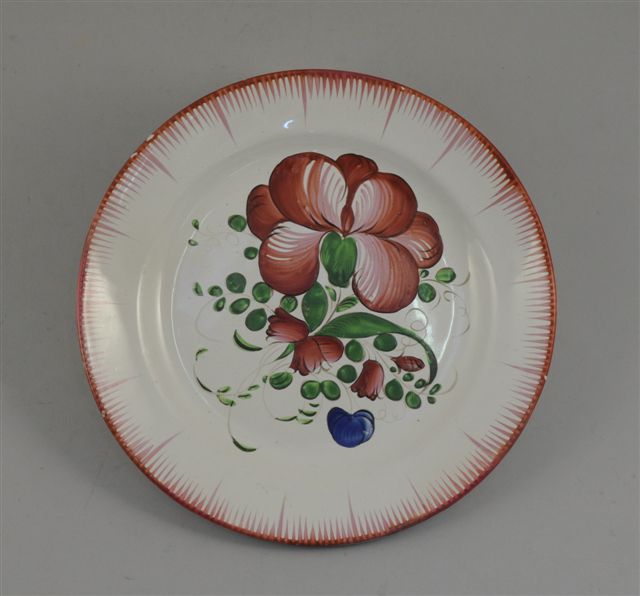 EST de la FRANCE. PLAT rond en faïence, à décor dans le bassin d'une large fleur. Bordure au peigne.