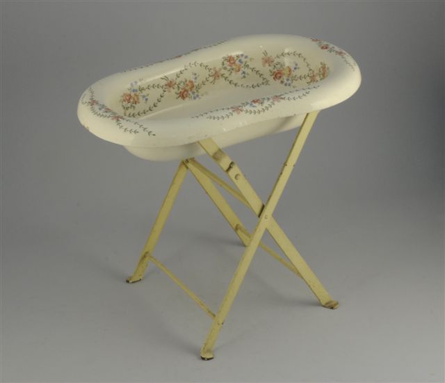 LONGCHAMP. BIDET à cuvette en faïence fine à décor imprimé et peint de guirlandes florales nouées de rubans. Modèle "Marie-Antoinette". Piètement en fer forgé relaqué jaune pâle. Haut. 42,5, Long. 51, Larg. 32 cm (quelques éclats)