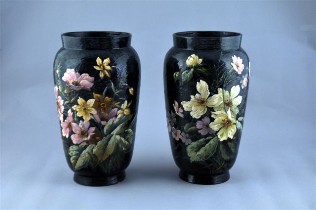 PAIRE DE VASES en céramique impressionniste, à décor en barbotine colorée de fleurs sur fond vert.