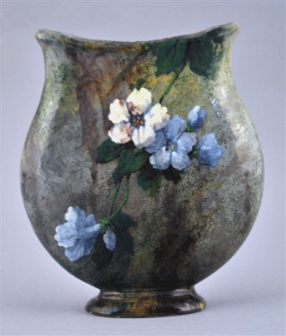 VASE PAR LAMBERT en céramique impressionniste à panse aplatie, au décor à la "barbotine colorée". Sur une face, des fleurs d'hibiscus, sur l'autre, des fleurs de pervenches blanches et bleues sur un fond vert dégradé. Signé LAMBERT.