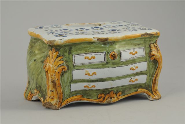 NEVERS.COMMODE-BOUQUETIÈRE en faïence de grand feu ocre, vert, bleu et filets manganèse, de forme Louis XV.