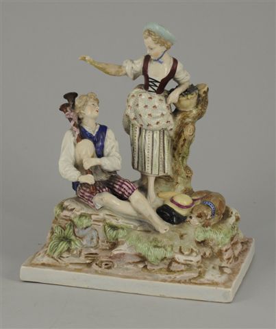 NIDERVILLERS (dans le goût de). GROUPE en faïence fine polychrome représentant un homme à sa cornemuse, une femme à la corbeille de fleurs et un chien à leurs pieds.