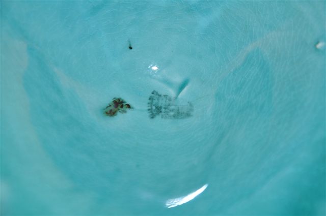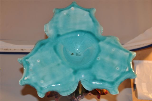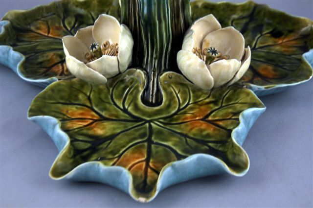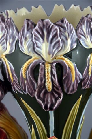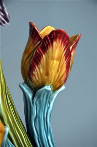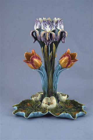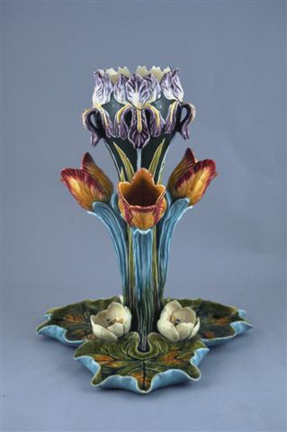ONNAING. SURTOUT DE TABLE AUX IRIS ET TULIPES en barbotine décorée au naturel, composé d'un grand vase central décoré de fleurs d'iris. Sur la base du fût jaillissent trois autres vases en forme de tulipes, le pied représentant trois fleurs et feuilles de nénuphar (quatre petits éclats sur les feuilles de nénuphar).