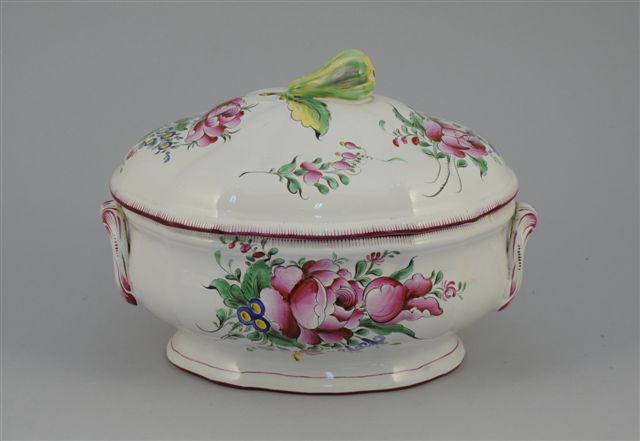 SAINT-CLÉMENT. SOUPIERE ovale en faïence de forme mouvementée à décor floral. Anses latérales, prise du couvercle en poire.