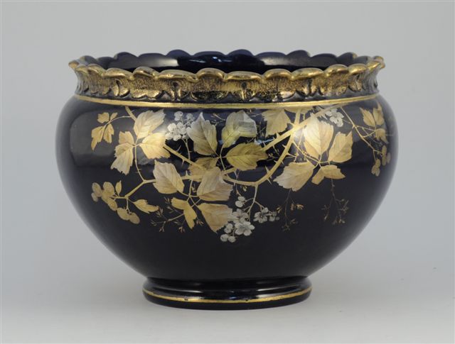 VALLAURIS. DELPHIN MASSIER. CACHE-POT pansu en faïence émaillée bleu nuit orné d'un décors à l'or de branches de mûrier. Col polylobé en forme de pétales et de feuilles. Signature dorée "DELPHIN MASSIER / VALLAURIS (AIN)".
