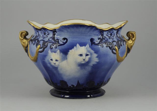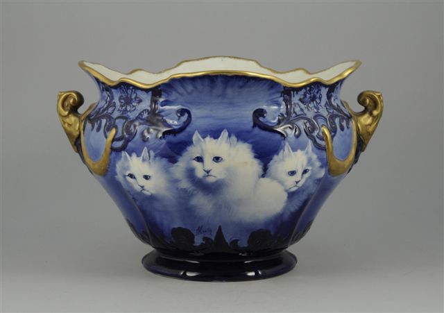 VARIA. CACHE-POT de forme mouvementée en faïence fine à décor, sur les deux faces, de chats en camaieu bleu. Anses en volutes et guirlandes de lauriers or. Signé B. Hustin (?).