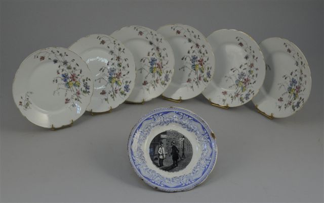 Suite de SIX ASSIETTES à dessert en porcelaine à décor polychrome imprimé et peint de fleurs des champs, aile polylobée. Début XXème. Diam. 19,5 cm. (infimes égrenures)
