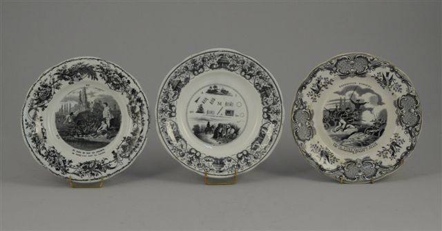 VARIA. LOT comprenant: CREIL et MONTEREAU. DEUX ASSIETTES en faïence fine à décor imprimé en noir: ASSIETTE de la série des mois de l'année: "Mai", aile à frise de fleurs des champs (Diam. 20,5 cm). ASSIETTE-RÉBUS, marque de Leboeuf et Millet (Diam. 21,5 cm)