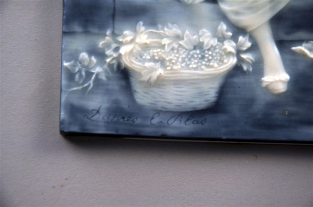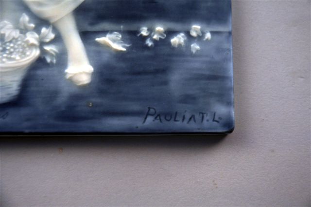 VARIA. PLAQUE RECTANGULAIRE en faïence à l'imitation de Wedgwood, à décor blanc sur bleu d'une jeune bacchante vendageant. Signé en bas à droite "PAULIAT L." "d'après E. Blas".