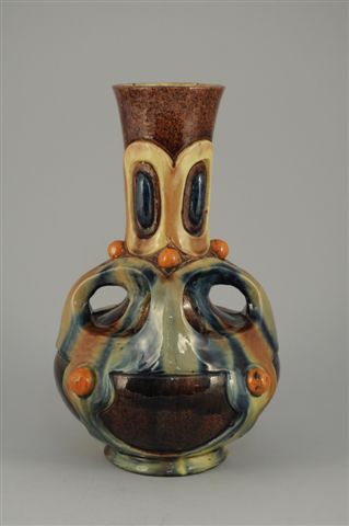 VARIA. VASE en faïence fine de type "barbotine", de forme pansue, orné de cabochons. L'épaulement formé de quatre anses. Le col orné d'oves. Couverte polychrome. Haut. 37 cm.