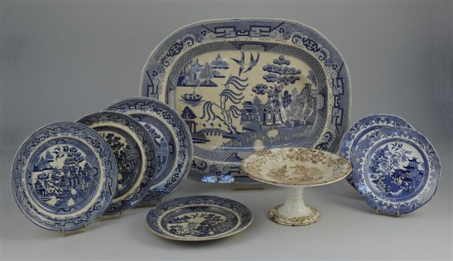 ANGLETERRE. LOT comprenant: STAFFORSHIRE. Grand PLAT ovale (à asperges?) en faïence fine à décor imprimé en bleu d'inspiration chinoise: pagodes, pont, oiseaux, fleurs et végétaux. Marqué Warrented STAFFORSHIRE JH. Long. 49, Larg. 38 cm.