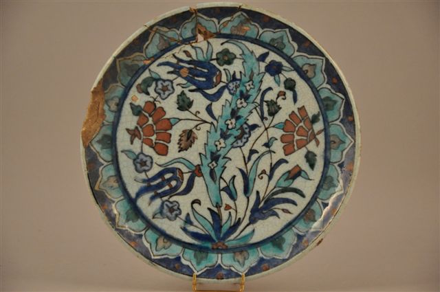 IZNIK. PLAT rond en faience à décor floral aux deux tulipes, rouge, turquoise, bleu et manganèse. Travail ancien. Diam. 28 cm (accidents et manques)