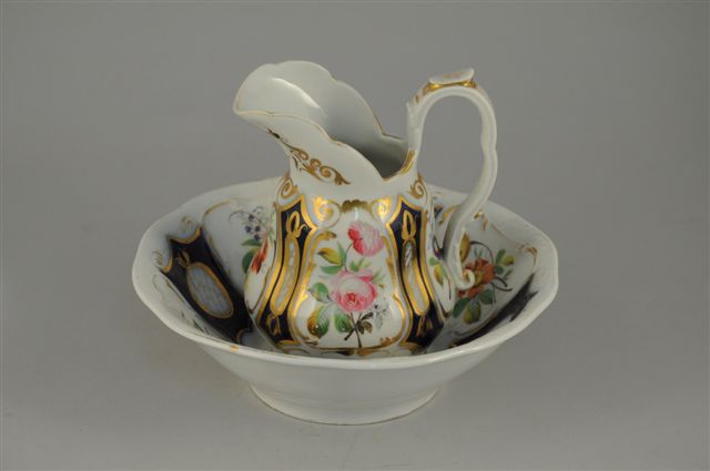 PARIS (?). Ensemble de TOILETTE en porcelaine comprenant une vasque et un broc de forme mouvementée. Décor peint de fleurs dans des cartouches. Fin XIXème.