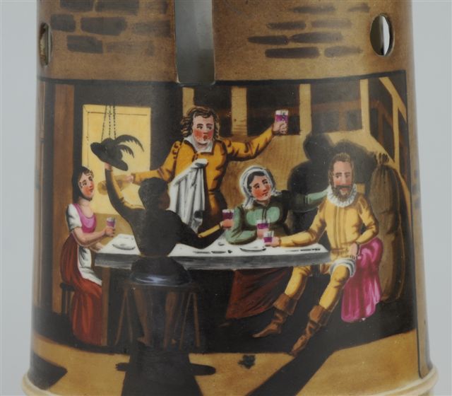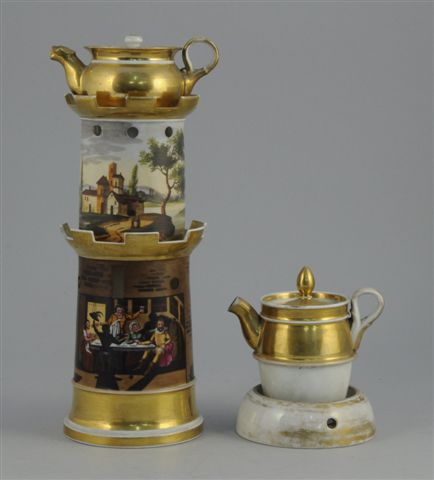 PARIS. Grande TISANIÈRE en porcelaine dorée représentant une haute tour crénelée à deux niveaux, en trois éléments. Le premier niveau à décor polychrome peint d'une scène nocturne de taverne, le second niveau à décor tournant d'un paysage animé de personnages. Verseuse à bec verseuse zoomorphe.