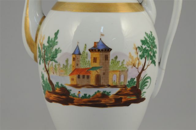 PARIS. Grande VERSEUSE en porcelaine. Le corps ovoïde. Décor peint en polychromie , sur une face d'un château fort dan une perpective paysagée, sur l'autre face, d'un paysage au château en ruine. Filets et frise feuillagée or au col.