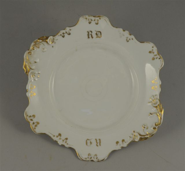 PARIS. LOT comprenant: DEUX ASSIETTES formant paire à décor peint en polychromie, dans le bassin, pour l'une, de roses sauvages, pour l'autre, de volubilis, le marlis et l'aile à fines frises florales or, bordure lobée à filet or. Marquées Leblanc. (Diam. 22,5 cm, éclat et fêle, deux égrenures). PLAT à bordure lobée dorée de motifs feuillagés, les anses à motifs en reliefs de fleurs en corolles, monogrammé RD à l'or. (Diam. 27,5 cm).