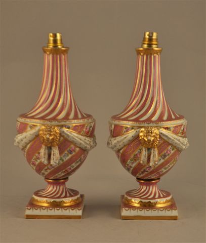 PARIS. PAIRE DE VASES BALLUSTRES en porcelaine montés à l'électricité, à décor torsadé roses et blanc rehaussé d'or et de fines roses polychrome sur des réserves blanches. Col à godron torsadé, anses à têtes de lion dorées réunis par des draperies dorées sur fond blanc, pied torsadé reposant sur un socle carré.