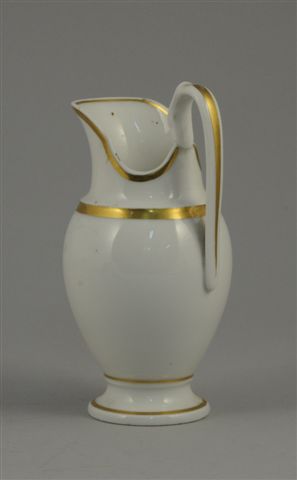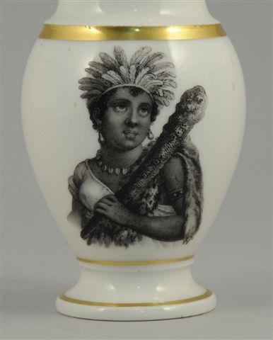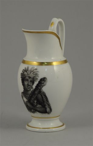 PARIS. POT à LAIT en porcelaine. Le corps ovoïde sur piédouche à décor imprimé en noir d'une femme coiffée de plumes et tenant une massue, symbolisant "l'Afrique" ou "Le bon sauvage". Filets or. Première moitié du XIXème. Haut. 21 cm.
