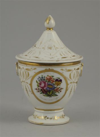 PARIS. SUCRIER en porcelaine sur piédouche. Décor sur le corps et le couvercle à l'or de frises feuillagées ornée de pampres de vigne et motifs en mansorle. Dans deux réserves circulaires, rébus à décor polychrome peint, sur une face, "Mes [pensées] sont à vous", et, sur l'autre face ""Recevez ce [bouquet], l'amitié vous l'offre". Anses latérales en anneau simulés. Prise du couvercle en bouton pointu.