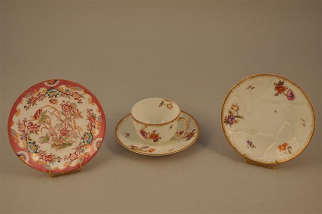 Joint: une sous-tasse au modèle (fêle) et une sous-tasse dans le goût de Minton marqué Sarreguemines. Diam. 15 cm.